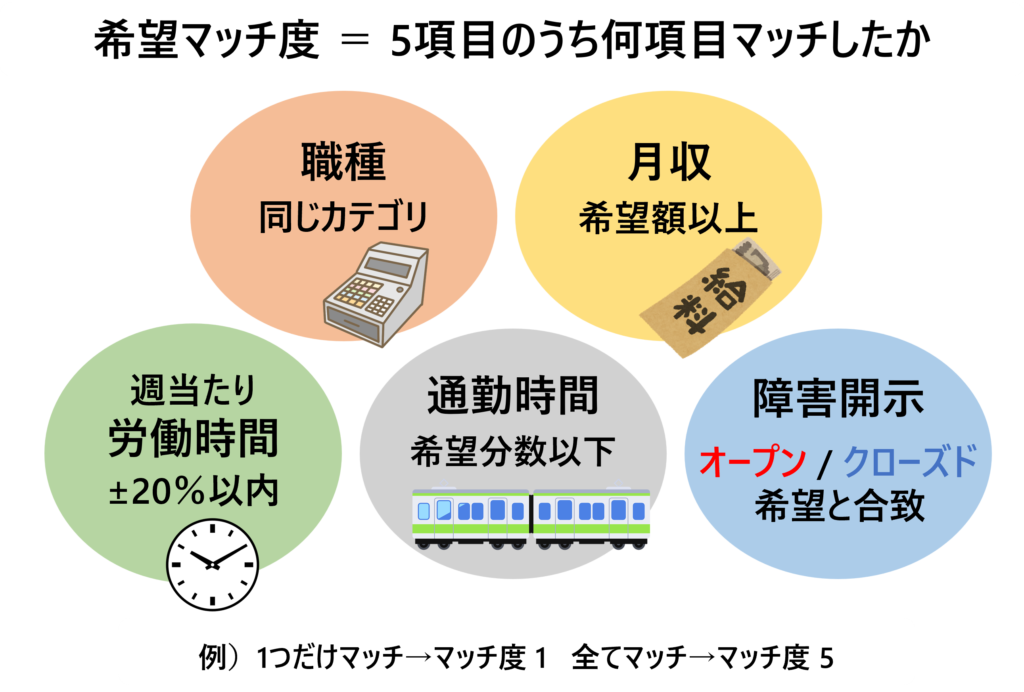 就労支援サービスを利用して就職した人についてデータを取り、職種・月収・労働時間・通勤時間・障害開示の5項目のうち何項目が希望とマッチしたかという「希望マッチ度」と、その仕事がどれだけ続いたか(就労期間)の関連を調べました。