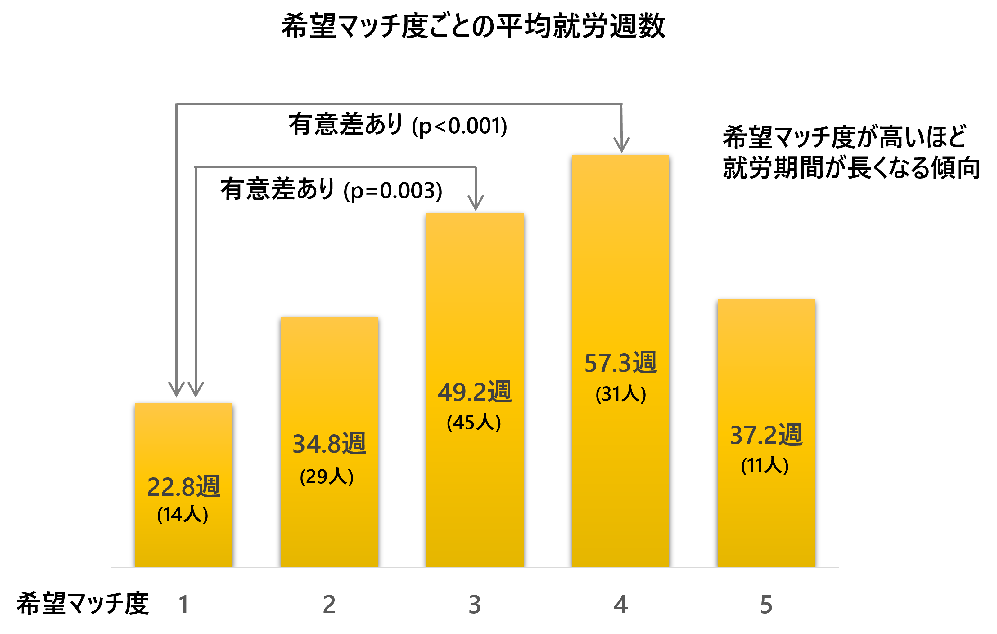 分析の結果、マッチ度が高いほど就労期間が長い傾向がありました。マッチ度3の就労期間(平均49.2週)と、マッチ度4の就労期間(平均57.3週)は、それぞれマッチ度1の就労期間(平均22.8週)よりも有意に長いことが示されました。また、マッチ度の低い群(1・2)と高い群(3・4・5)の2群に分けて比較しても、マッチ度の高い群の就労期間が有意に長いことが示されました。
