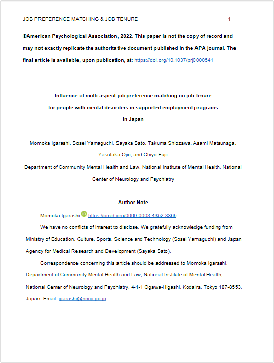 Igarashi M, Yamaguchi S, Sato S, Shiozawa T, Matsunaga A, Ojio Y, et al. Influence of multi-aspect job preference matching on job tenure for people with mental disorders in supported employment programs in Japan. Psychiatr Rehabil J. 2022;46(2):101-8. https://doi.org/10.1037/prj0000541