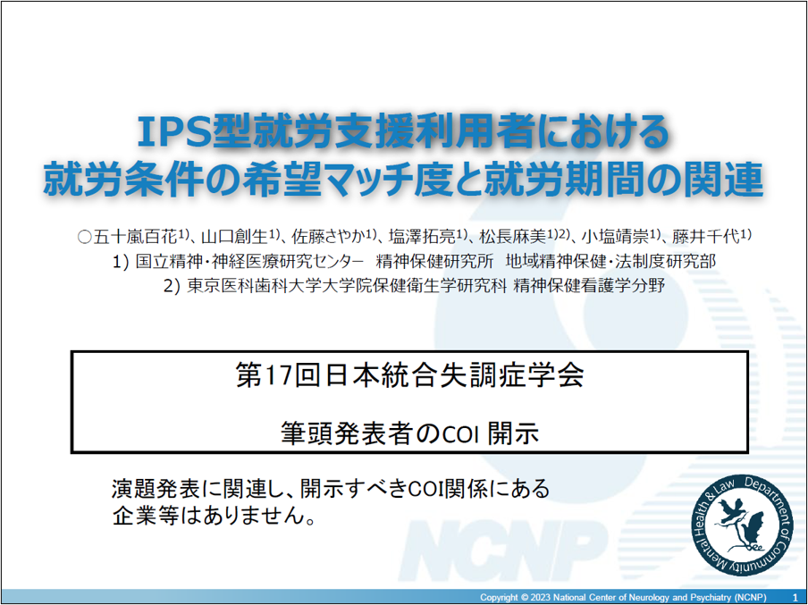 五十嵐百花, 山口創生, 佐藤さやか, 塩澤拓亮, 松長麻美, 小塩靖崇 他. IPS型就労支援利用者における就労条件の希望マッチ度と就労期間の関連. 第17回日本統合失調症学会. オンライン, 2023年3月26日(口頭発表)
