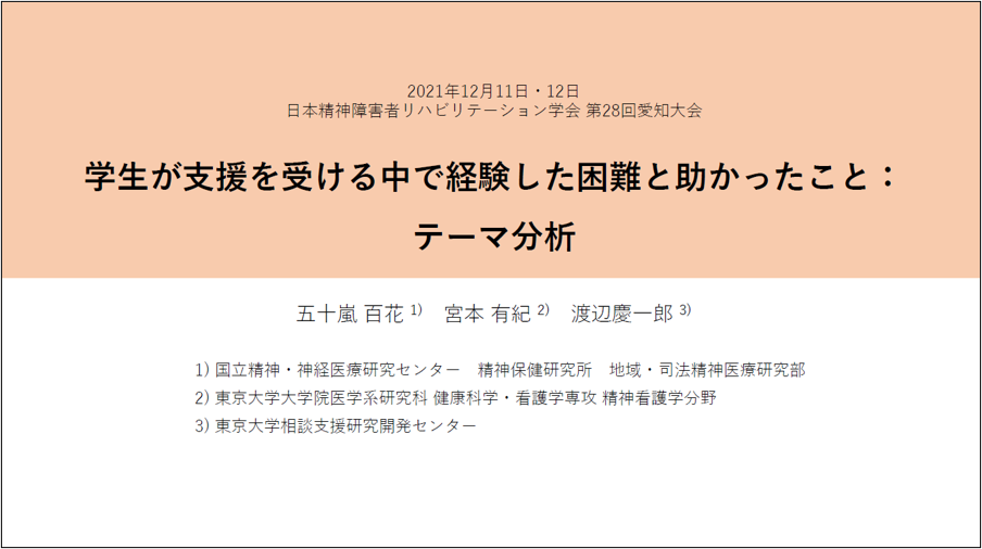 五十嵐百花,宮本 有紀, 渡辺 慶一郎. 学生が支援を受ける中で経験した困難と助かったこと:テーマ分析.第28回日本精神障害者リハビリテーション学会. オンライン, 2021年12月11日(口頭発表)