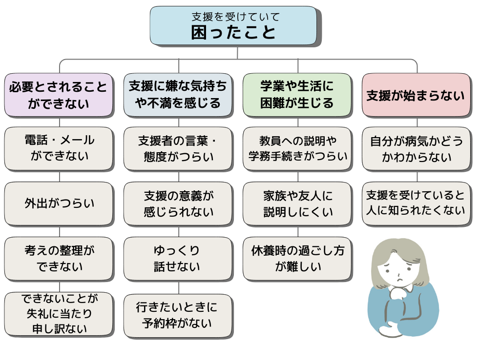 例えば授業を欠席した場合の措置について教員と話す時など、自分1人で状況を説明したり手続きをこなしたりしなければならず、つらいと感じていました。「甘えと言われたら何も言えない」などの気持ちから、家族や友人にも話しにくいと感じていました。また、休養中に自分で何かしようと思ってもうまくいかず、どう過ごしたらいいのか難しいと感じていました。