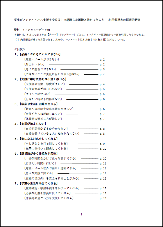 精神科クリニック、学内保健センター、学生相談所などのメンタルヘルスに関する支援を3か月以上受けたことがある大学生・大学院生を対象にインタビューを行いました。対象者は7名(男性5名、女性2名)で、診断はうつ病、双極性障害、発達障害、摂食障害でした。支援を受けた期間は平均で約5年半でした。インタビューは逐語録に起こされ、テーマ分析という手法を用いて分析されました。