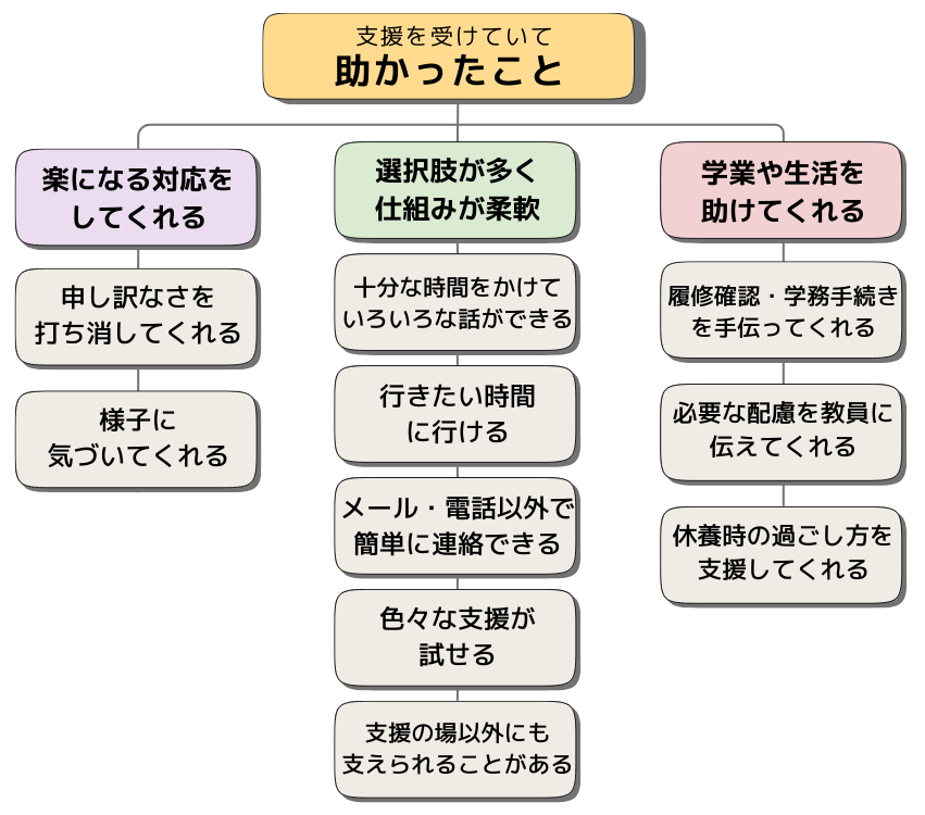体調や精神面の支援に限らず、学業・生活面の課題を解決してくれて助かったと感じていました。授業をあと何回休んだらまずいかなど、1人で調べたり管理したりするのが難しいことを一緒に確認できて良かったと語られました。また、学務課や教員の会議にかけてくれ、配慮について周知してくれたことに感謝していました。休学時にも、体調に配慮した環境でできるアルバイトを紹介してくれるなど、過ごし方を提案してくれて助かったと感じていました。